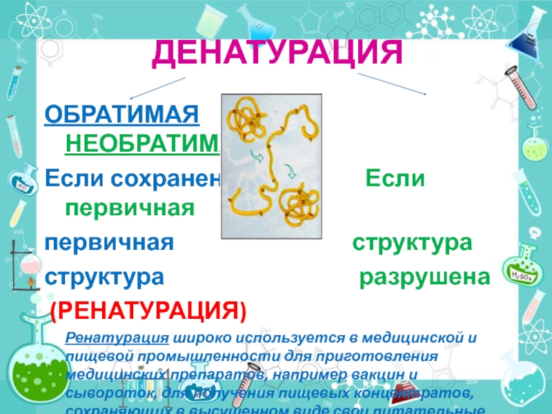 Денатурация - разрушение вторичной и третичной структур белка, – потеря белками биологической активности.