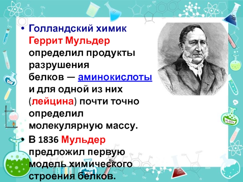 Слайд 7Голландский химик Геррит Мульдер определил продукты разрушения белков — аминокислоты и для одной из