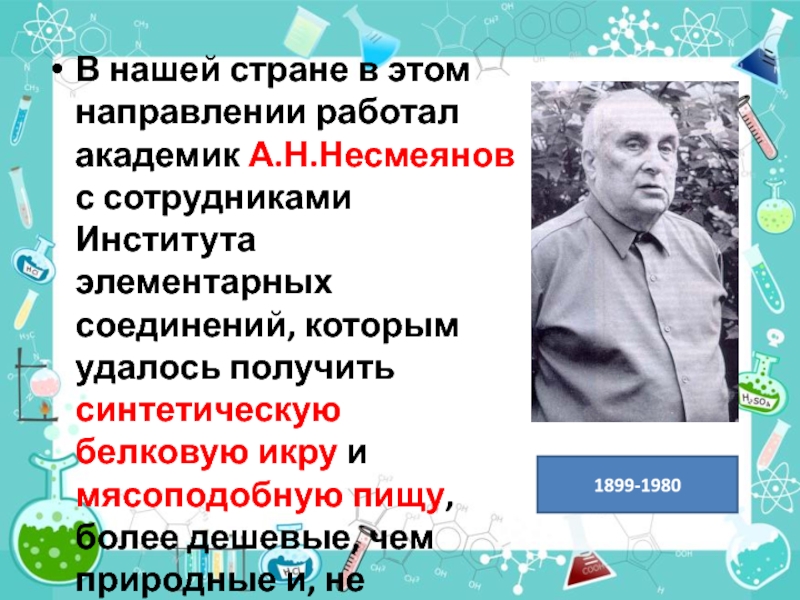 Института элементарных соединений, которым удалось получить синтетическую белковую икру и мясоподобную пищу, более дешевые, чем природные и, не уступающие им по качеству.