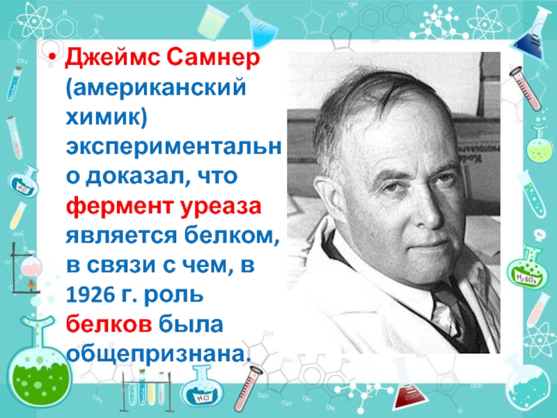 Слайд 12Джеймс Самнер (американский химик) экспериментально доказал, что фермент уреаза является белком,