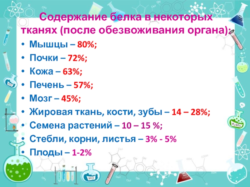Слайд 57Содержание белка в некоторых тканях (после обезвоживания органа):