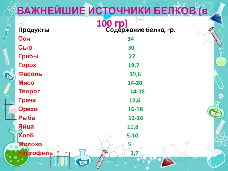 Слайд 55ВАЖНЕЙШИЕ ИСТОЧНИКИ БЕЛКОВ (в 100 гр)