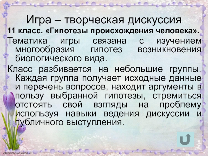 Игра – творческая дискуссия11 класс. «Гипотезы происхождения человека». Тематика игры связана с изучением многообразия гипотез возникновения биологического
