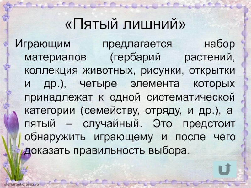 «Пятый лишний»Играющим предлагается набор материалов (гербарий растений, коллекция животных, рисунки, открытки и др.), четыре элемента которых принадлежат