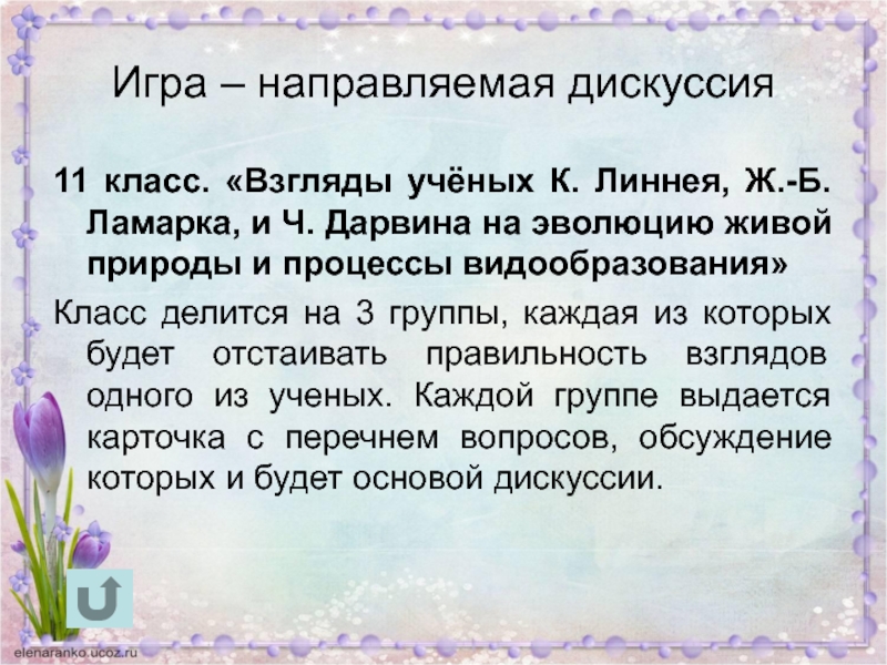 Игра – направляемая дискуссия11 класс. «Взгляды учёных К. Линнея, Ж.-Б. Ламарка, и Ч. Дарвина на эволюцию живой