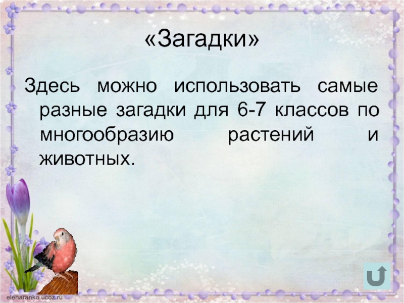 «Загадки»Здесь можно использовать самые разные загадки для 6-7 классов по многообразию растений и животных.