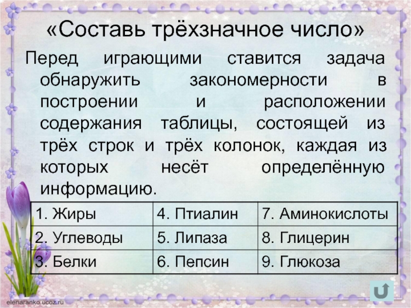 «Составь трёхзначное число»Перед играющими ставится задача обнаружить закономерности в построении и расположении содержания таблицы, состоящей из трёх