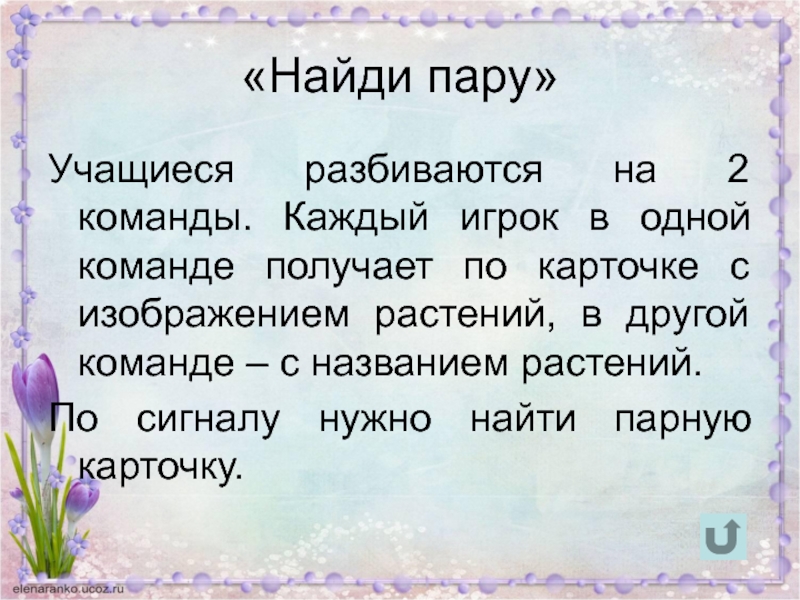 «Найди пару»Учащиеся разбиваются на 2 команды. Каждый игрок в одной команде получает по карточке с изображением растений,
