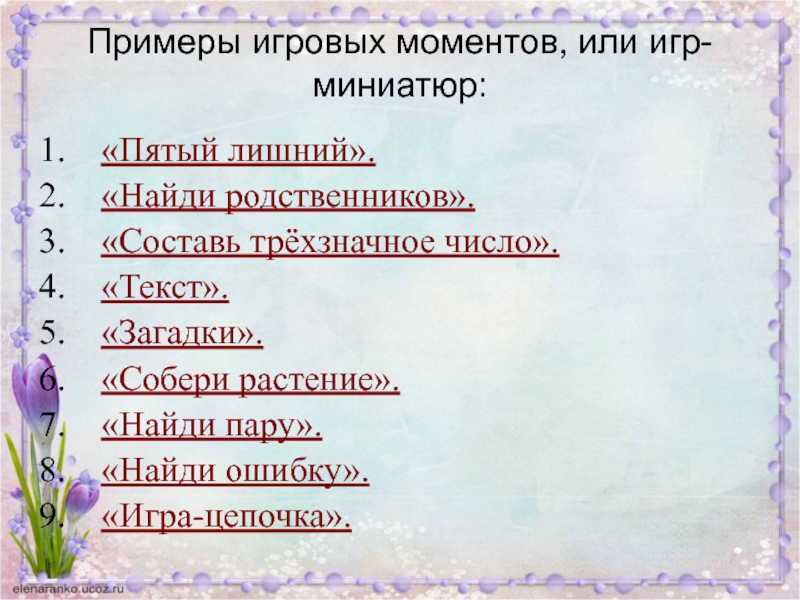 Примеры игровых моментов, или игр-миниатюр:«Пятый лишний».«Найди родственников».«Составь трёхзначное число».«Текст».«Загадки».«Собери растение».«Найди пару».«Найди ошибку».«Игра-цепочка».