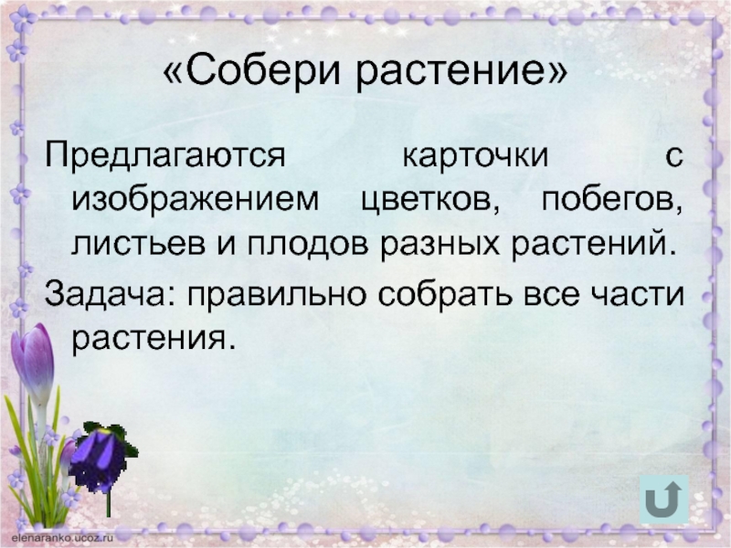 «Собери растение»Предлагаются карточки с изображением цветков, побегов, листьев и плодов разных растений.Задача: правильно собрать все части растения.