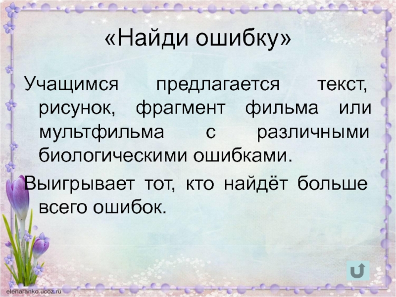 «Найди ошибку»Учащимся предлагается текст, рисунок, фрагмент фильма или мультфильма с различными биологическими ошибками.Выигрывает тот, кто найдёт больше