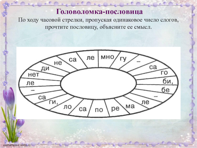Головоломка-пословица  По ходу часовой стрелки, пропуская одинаковое число слогов, прочтите пословицу, объясните ее смысл.