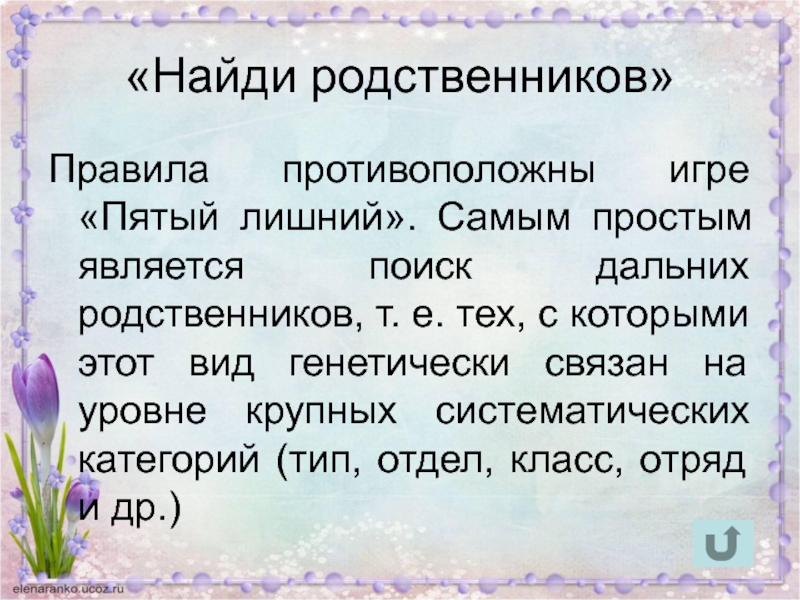 «Найди родственников»Правила противоположны игре «Пятый лишний». Самым простым является поиск дальних родственников, т. е. тех, с которыми