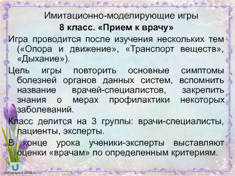 Имитационно-моделирующие игры8 класс. «Прием к врачу»Игра проводится после изучения нескольких тем («Опора и движение», «Транспорт веществ», «Дыхание»).