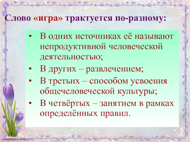 Слово «игра» трактуется по-разному:В одних источниках её называют непродуктивной человеческой деятельностью;В других – развлечением;В третьих – способом