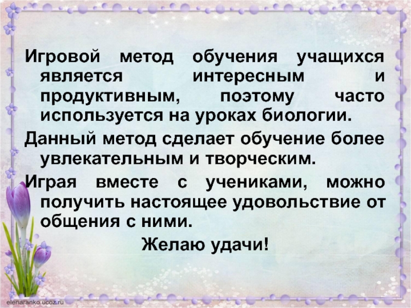 Игровой метод обучения учащихся является интересным и продуктивным, поэтому часто используется на уроках биологии.Данный метод сделает обучение
