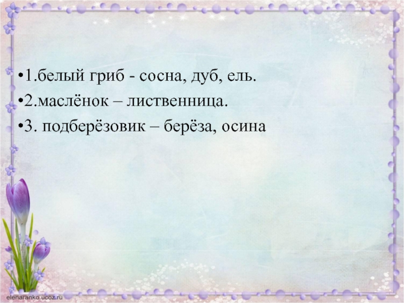 1.белый гриб - сосна, дуб, ель. 2.маслёнок – лиственница. 3. подберёзовик – берёза, осина