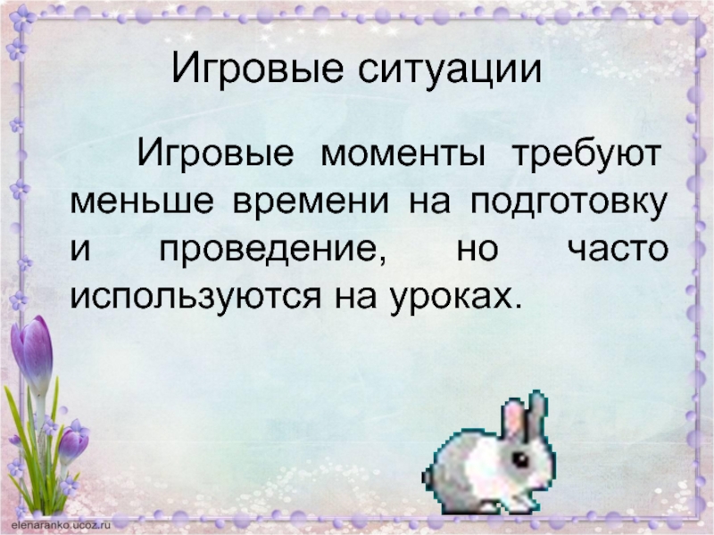 Игровые ситуации   Игровые моменты требуют меньше времени на подготовку и проведение, но часто используются на