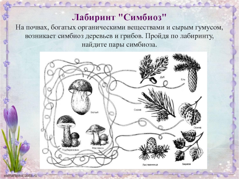 деревьев и грибов. Пройдя по лабиринту, найдите пары симбиоза.