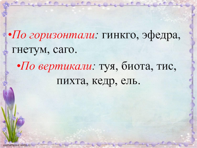По горизонтали: гинкго, эфедра, гнетум, саго.По вертикали: туя, биота, тис, пихта, кедр, ель.