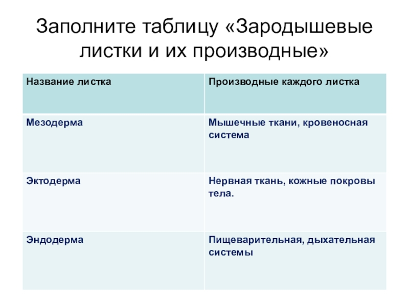 Слайд 22Заполните таблицу «Зародышевые листки и их производные»