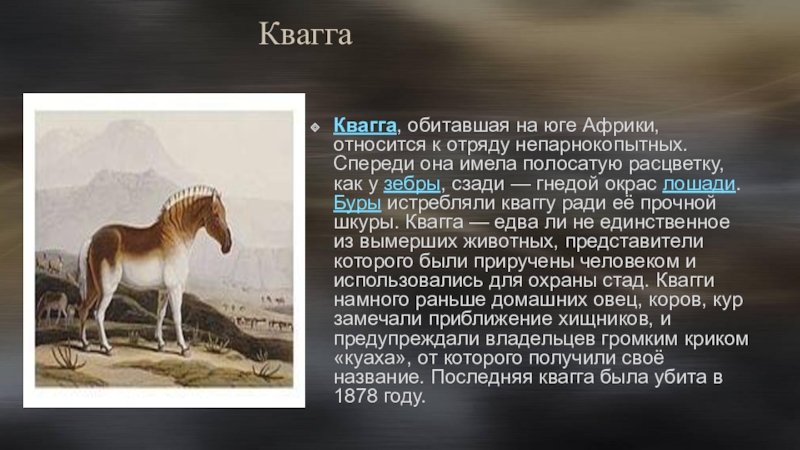 имела полосатую расцветку, как у зебры, сзади — гнедой окрас лошади. Буры истребляли кваггу ради её прочной шкуры. Квагга — едва ли не единственное из вымерших животных, представители которого были приручены человеком и использовались для охраны стад. Квагги намного раньше домашних овец, коров, кур замечали приближение хищников, и предупреждали владельцев громким криком «куаха», от которого получили своё название. Последняя квагга была убита в 1878 году.