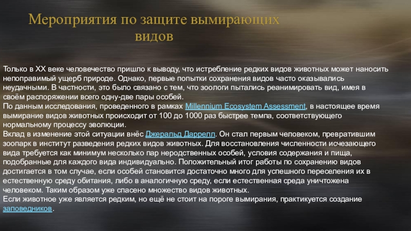 Вклад в изменение этой ситуации внёс Джеральд Даррелл. Он стал первым человеком, превратившим зоопарк в институт разведения редких видов животных. Для восстановления численности исчезающего вида требуется как минимум несколько пар неродственных особей, условия содержания и пища, подобранные для каждого вида индивидуально. Положительный итог работы по сохранению видов достигается в том случае, если особей становится достаточно много для успешного переселения их в естественную среду обитания, либо в аналогичную среду, если естественная среда уничтожена человеком. Таким образом уже спасено множество видов животных.