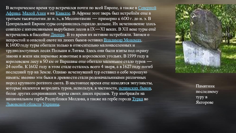 в Северной Африке, Малой Азии и на Кавказе. В Африке этот зверь был истреблён еще в третьем тысячелетии до н. э., в Месопотамии — примерно к 600 г. до н. э. В Центральной Европе туры сохранились гораздо дольше. Их исчезновение здесь совпало с интенсивными вырубками лесов в IX—XI веках. В XII веке туры ещё встречались в бассейне Днепра. В то время их активно истребляли. Записи о непростой и опасной охоте на диких быков оставил Владимир Мономах.