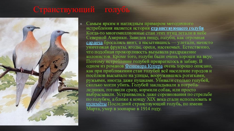 история странствующего голубя. Когда-то многомиллионные стаи этих птиц летали в небе Северной Америки. Завидев пищу, голуби, как огромная саранча бросались вниз, а насытившись — улетали, начисто уничтожая фрукты, ягоды, орехи, насекомых. Естественно, что подобная прожорливость вызывала раздражение колонистов. Кроме того, голуби были очень хороши на вкус. Поэтому истребление голубей превратилось в забаву. В одном из романов Фенимора Купера очень хорошо описано, как при приближении стаи голубей всё население городов и посёлков высыпало на улицы, вооружившись рогатками, ружьями, иногда даже пушками. Убивали столько голубей, сколько могли убить. Голубей закладывали в погреба-ледники, готовили сразу, кормили собак, или просто выбрасывали. Устраивались даже соревнования по стрельбе по голубям, а ближе к концу XIX века стали использовать и пулемёты Последний странствующий голубь, по имени Марта, умер в зоопарке в 1914 году.