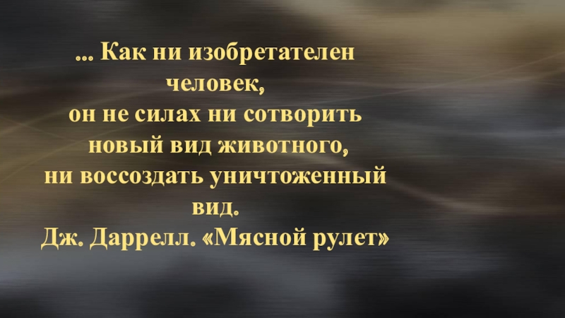 А единственный в своем роде чудесный вид, который эволюци онировал сотни тысяч лет, чтобы достичь сегодняшнего совершенства, можно отправить в небытие одним духом, как гасят огонек свечи, и никто даже пальцем не пошевельнет, кроме считанной горсточки людей, никто и слова не скажет в их защиту. ..» - так пишет Джеральд Даррелл в своей замечательной книге «Мясной рулет»