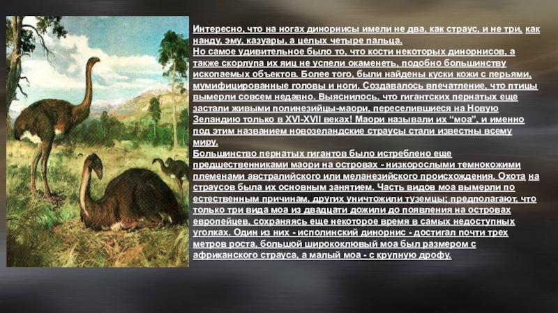 Слайд 14Интересно, что на ногах динорнисы имели не два, как страус, и