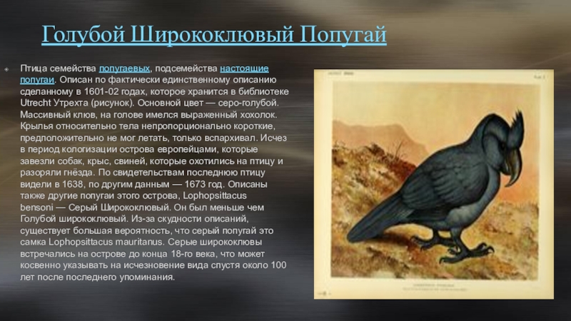 единственному описанию сделанному в 1601-02 годах, которое хранится в библиотеке Utrecht Утрехта (рисунок). Основной цвет — серо-голубой. Массивный клюв, на голове имелся выраженный хохолок. Крылья относительно тела непропорционально короткие, предположительно не мог летать, только вспархивал. Исчез в период кологизации острова европейцами, которые завезли собак, крыс, свиней, которые охотились на птицу и разоряли гнёзда. По свидетельствам последнюю птицу видели в 1638, по другим данным — 1673 год. Описаны также другие попугаи этого острова, Lophopsittacus bensoni — Серый Ширококлювый. Он был меньше чем Голубой ширококлювый. Из-за скудности описаний, существует большая вероятность, что серый попугай это самка Lophopsittacus mauritanus. Серые ширококлювы встречались на острове до конца 18-го века, что может косвенно указывать на исчезновение вида спустя около 100 лет после последнего упоминания.