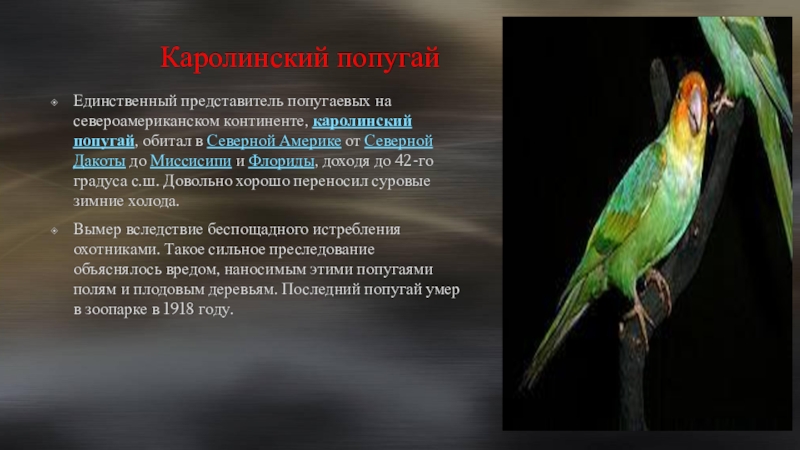 Единственный представитель попугаевых на североамериканском континенте, каролинский попугай, обитал в