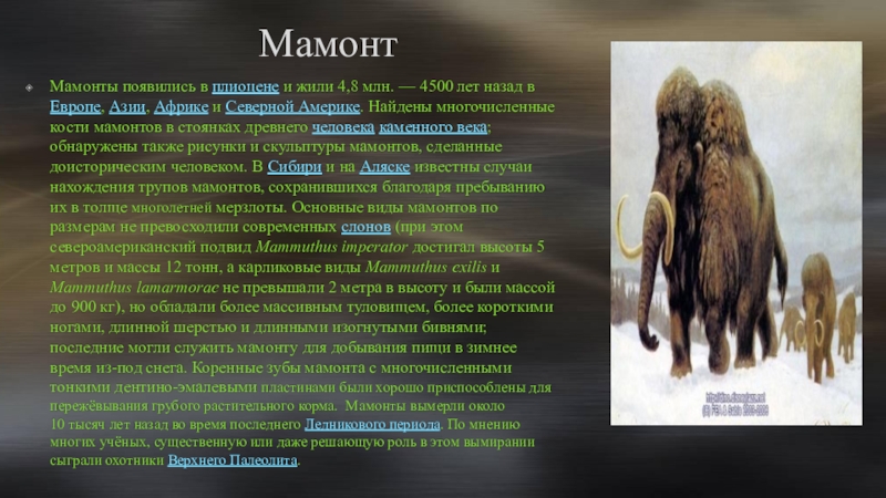 Европе, Азии, Африке и Северной Америке. Найдены многочисленные кости мамонтов в стоянках древнего человека каменного века; обнаружены также рисунки и скульптуры мамонтов, сделанные доисторическим человеком. В Сибири и на Аляске известны случаи нахождения трупов мамонтов, сохранившихся благодаря пребыванию их в толще многолетней мерзлоты. Основные виды мамонтов по размерам не превосходили современных слонов (при этом североамериканский подвид Mammuthus imperator достигал высоты 5 метров и массы 12 тонн, а карликовые виды Mammuthus exilis и Mammuthus lamarmorae не превышали 2 метра в высоту и были массой до 900 кг), но обладали более массивным туловищем, более короткими ногами, длинной шерстью и длинными изогнутыми бивнями; последние могли служить мамонту для добывания пищи в зимнее время из-под снега. Коренные зубы мамонта с многочисленными тонкими дентино-эмалевыми пластинами были хорошо приспособлены для пережёвывания грубого растительного корма. Мамонты вымерли около 10 тысяч лет назад во время последнего Ледникового периода. По мнению многих учёных, существенную или даже решающую роль в этом вымирании сыграли охотники Верхнего Палеолита.
