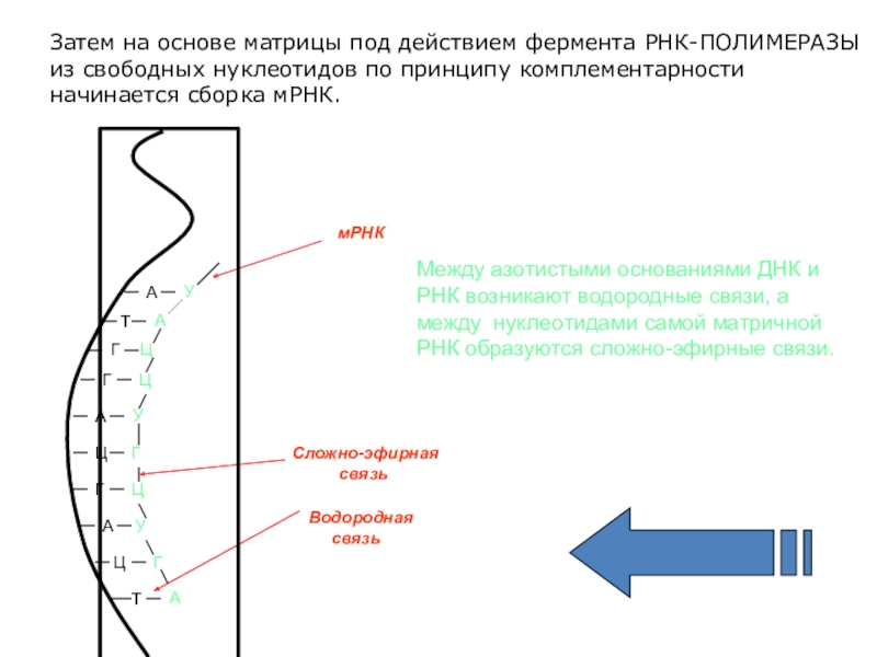 Затем на основе матрицы под действием фермента РНК-ПОЛИМЕРАЗЫ из свободных нуклеотидов по принципу комплементарности начинается сборка мРНК.