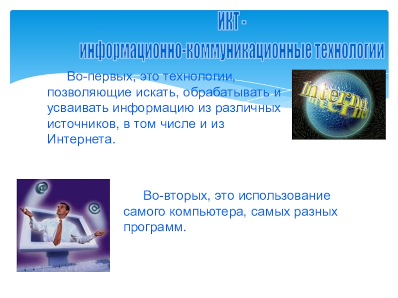 Во-первых, это технологии, позволяющие искать, обрабатывать и усваивать информацию из различных источников, в том числе и из Интернета.