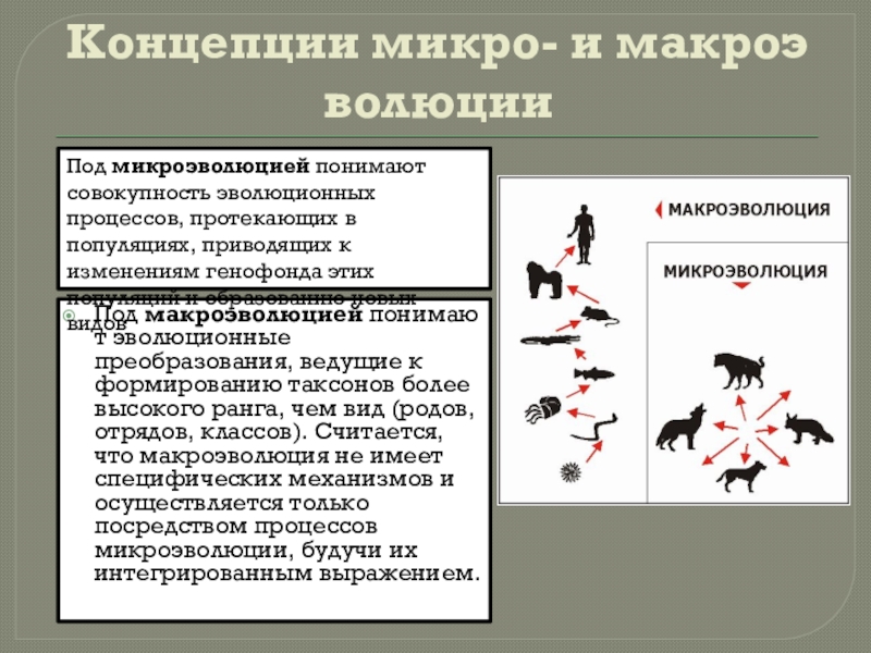 Под микроэволюцией понимают совокупность эволюционных процессов, протекающих в популяциях, приводящих к изменениям генофонда этих популяций и образованию новых видов