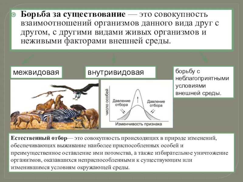 Естественный отбор— это совокупность происходящих в природе изменений, обеспечивающих выживание наиболее приспособленных особей и преимущественное оставление ими потомства, а также избирательное уничтожение организмов, оказавшихся неприспособленными к существующим или изменившимся условиям окружающей среды.