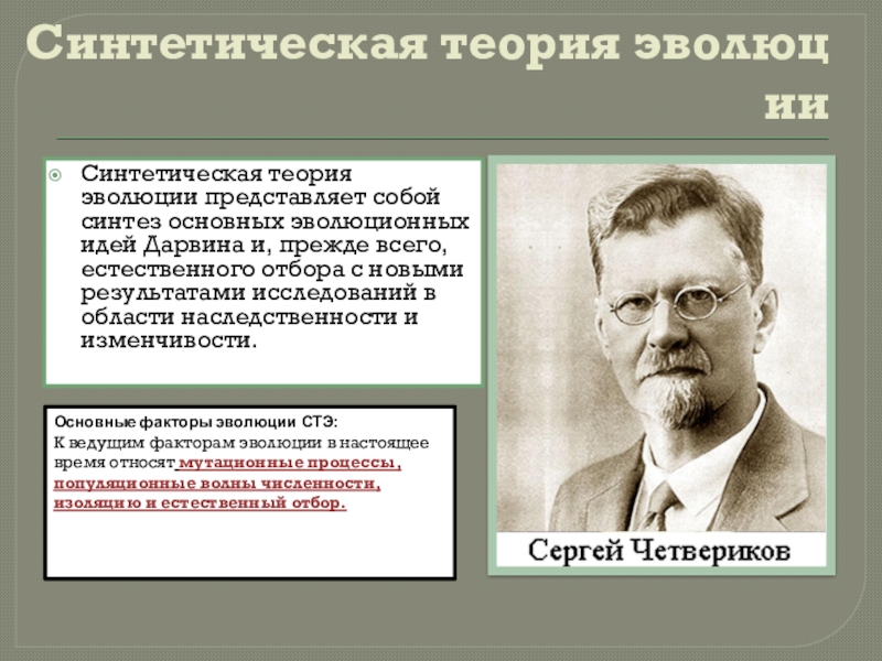 К ведущим факторам эволюции в настоящее время относят мутационные процессы, популяционные волны численности, изоляцию и естественный отбор.