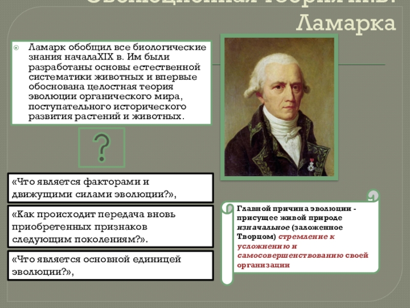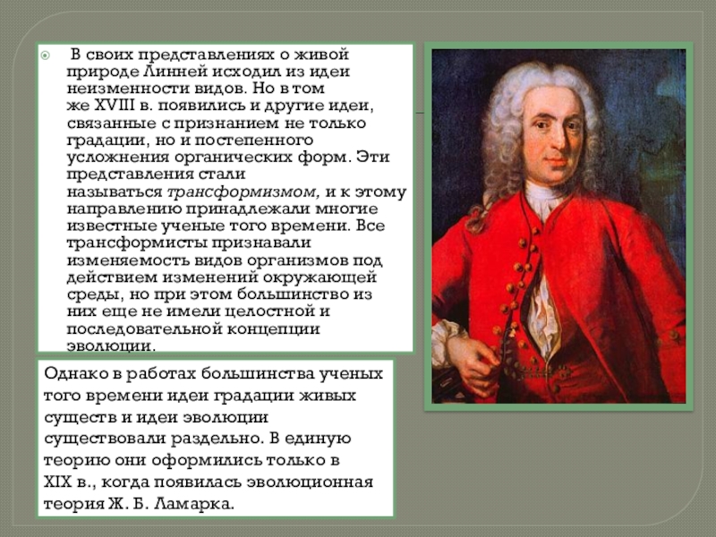 Однако в работах большинства ученых того времени идеи градации живых существ и идеи эволюции существовали раздельно. В единую теорию они оформились только в XIX в., когда появилась эволюционная теория Ж. Б. Ламарка.