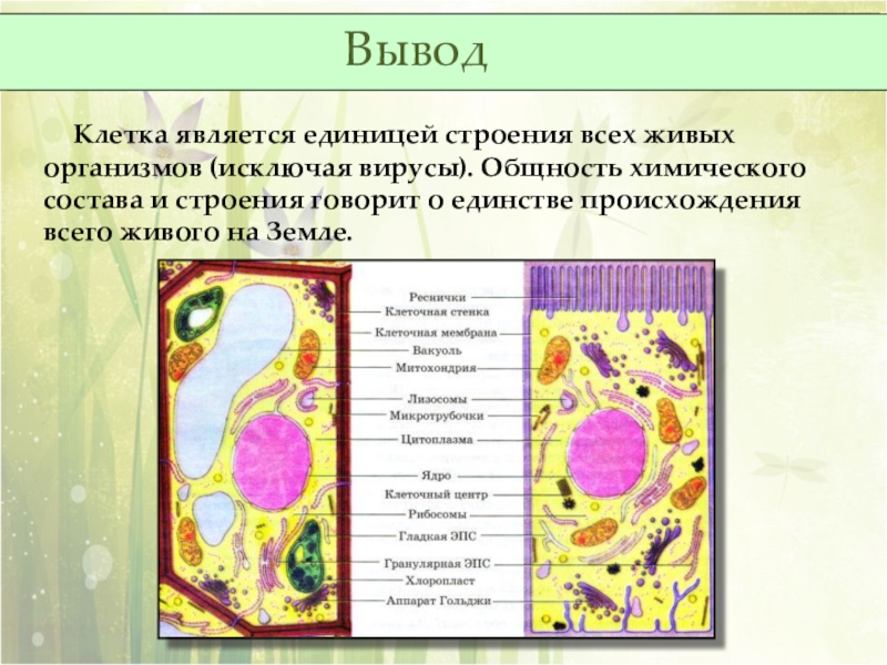 Клетка является единицей строения всех живых организмов (исключая вирусы). Общность химического состава и строения говорит