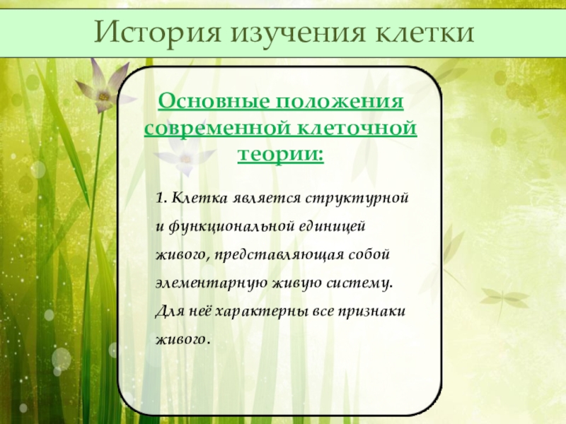 Основные положения современной клеточной теории:1. Клетка является структурной и функциональной единицей живого, представляющая собой элементарную живую систему.