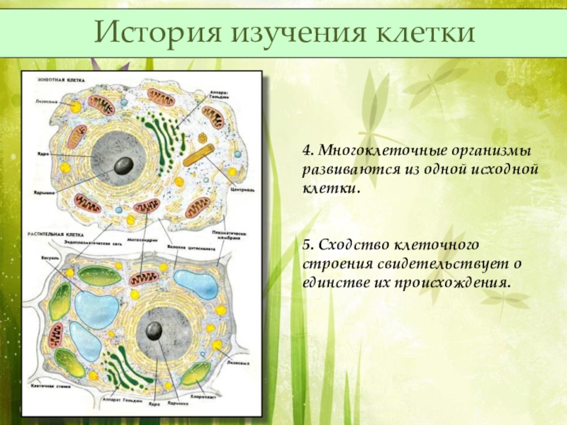 4. Многоклеточные организмы развиваются из одной исходной клетки.5. Сходство клеточного строения свидетельствует о единстве их происхождения.История изучения
