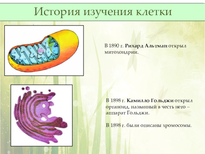 В 1890 г. Рихард Альтман открыл митохондрии. В 1898 г. Камилло Гольджи открыл органоид, названный в честь