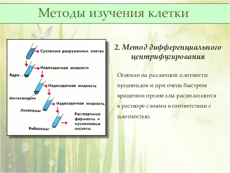 2. Метод дифференциального центрифугированияОснован на различной плотности органоидов и при очень быстром вращении органеллы располагаются в растворе