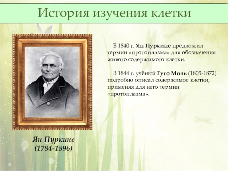 Ян Пуркине(1784-1896)  В 1840 г. Ян Пуркине предложил термин «протоплазма» для обозначения живого содержимого клетки.