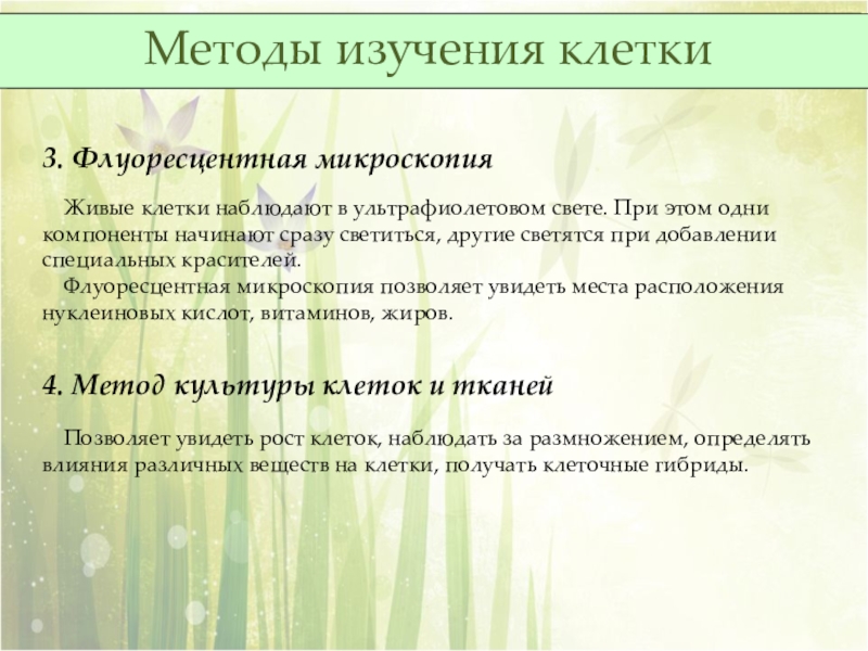 3. Флуоресцентная микроскопия  Живые клетки наблюдают в ультрафиолетовом свете. При этом одни компоненты начинают сразу светиться,