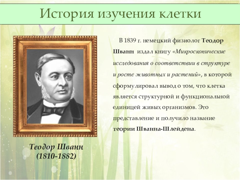 книгу «Микроскопические исследования о соответствии в структуре и росте животных и растений», в которой сформулировал вывод о том, что клетка является структурной и функциональной единицей живых организмов. Это представление и получило название теории Шванна-Шлейдена.