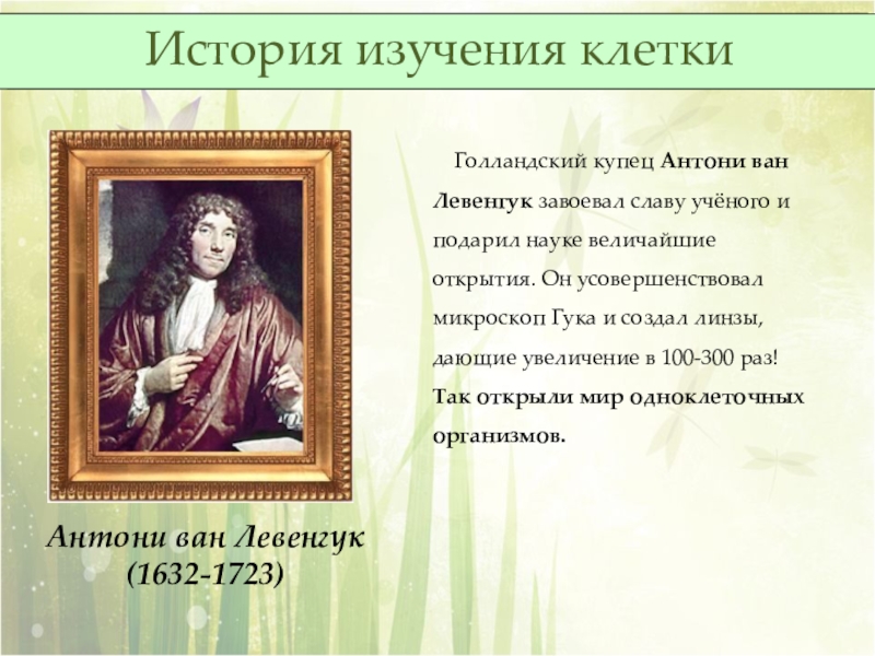 Слайд 5 Голландский купец Антони ван Левенгук завоевал славу учёного и