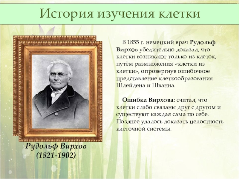 Ошибка Вирхова: считал, что клетки слабо связаны друг с другом и существуют каждая сама по себе.